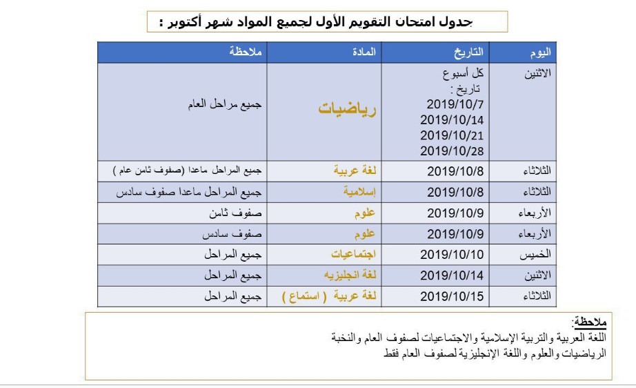 جدول أوقات التلاميذ خلال شهر أكتوبر 2020 المدرسة الابتدائية حي الأمل بالصخيرة Facebook