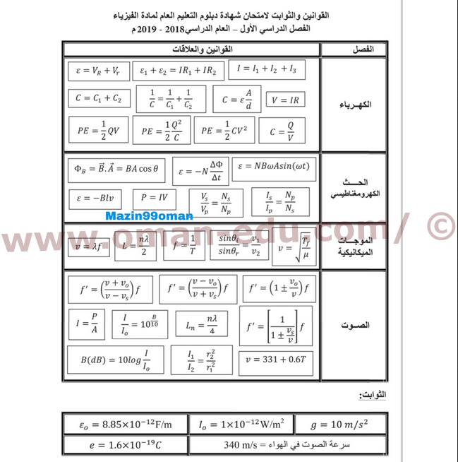مسودة من القوانين لمادة الفيزياء للصف ١٢ تأتي في الإمتحان
